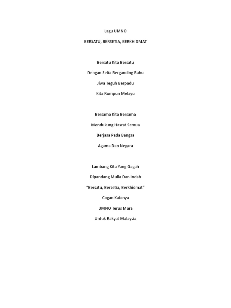 Hidup Melayu Teguh Bersatu Bergerak MajuPimpinan Luhur Terbilang MasyhurUMNO JohorSeia Sekata Bulat Cita-Cita Bertekad WajaBersama Janji. Lirik Lagu Negaraku Negaraku Tanah tumpahnya darahku Rakyat hidup bersatu dan maju Rahmat bahagia Tuhan kurniakan Raja kita selamat bertakhta Rahmat bahagia Tuhan kurniakan. Kau bilang padaku baik-baik sayang abang pasti cepat pulang Kau janjikan aku sebungkah berlian sesuap nasi pun jarang.